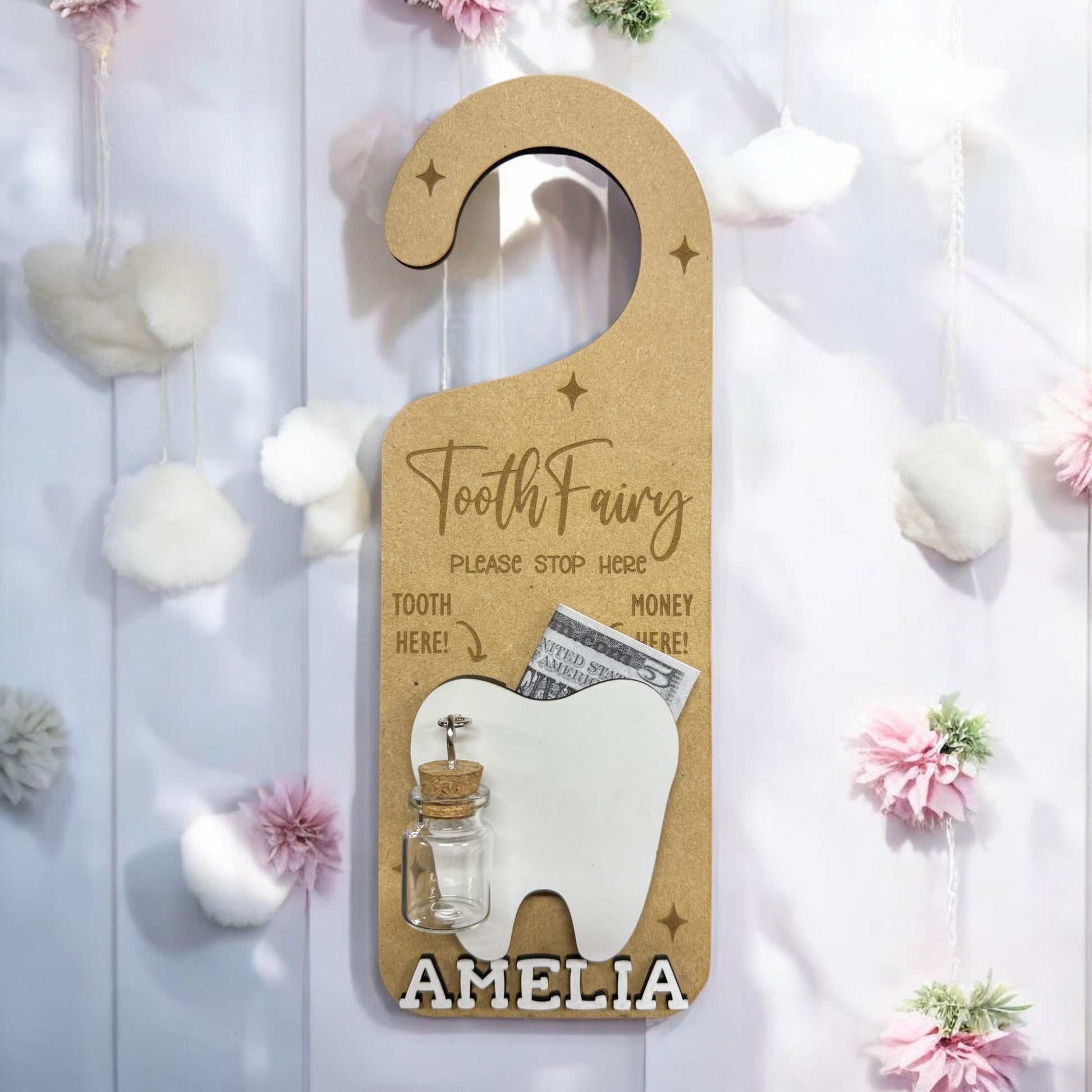 Custom made laser tooth fairy door hanger! Door hanger comes with glass vial to hold tooth. Our custom door hanger makes life a little easier for the tooth fairy! ;)